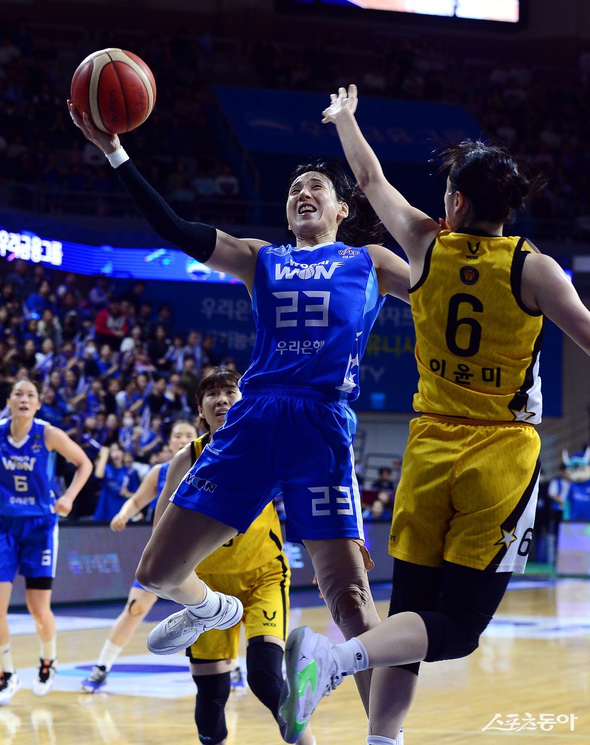 30일 충남 아산 이순신체육관에서 열린 ‘우리은행 우리 WON 2023-2024 여자프로농구’ 아산 우리은행과 청주 KB의 챔피언결정전 4차전 경기에서 우리은행 김단비가 KB 이윤미의 수비를 피해 슛을 쏘고 있다.