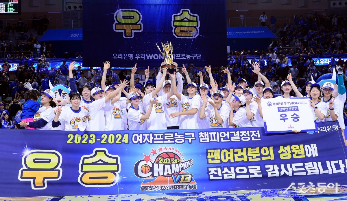 30일 충남 아산 이순신체육관에서 열린 ‘우리은행 우리 WON 2023-2024 여자프로농구’ 아산 우리은행과 청주 KB의 챔피언결정전 4차전 경기에서 우리은행이 KB를 꺾고 2년 연속 우승을 차지한 후 박혜진, 위성우 감독, 김단비가 우승 트로필르 들고 기념촬영을 하고 있다.