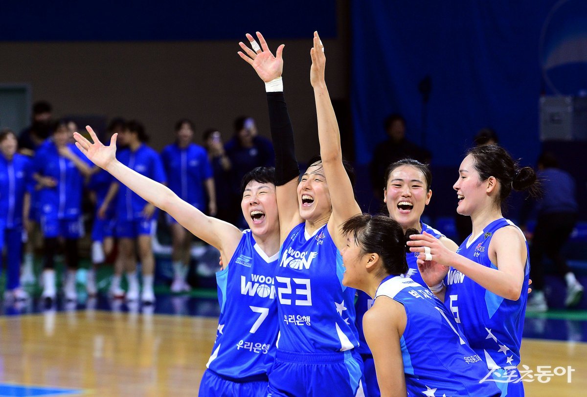 30일 충남 아산 이순신체육관에서 열린 ‘우리은행 우리 WON 2023-2024 여자프로농구’ 아산 우리은행과 청주 KB의 챔피언결정전 4차전 경기에서 우리은행이 KB를 꺾고 2년 연속 우승을 차지한 후 선수들이 코트에서 기쁨을 나누고 있다.