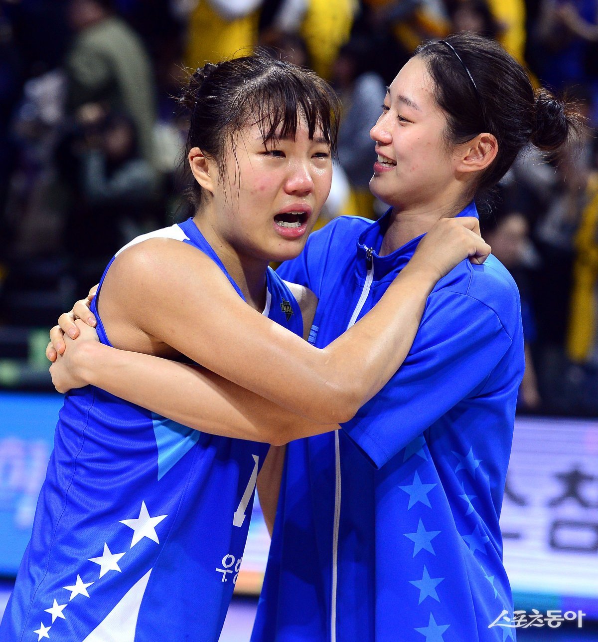 30일 충남 아산 이순신체육관에서 열린 ‘우리은행 우리 WON 2023-2024 여자프로농구’ 아산 우리은행과 청주 KB의 챔피언결정전 4차전 경기에서 우리은행이 KB를 꺾고 2년 연속 우승을 차지한 후 박지현이 눈물을 흘리고 있다.