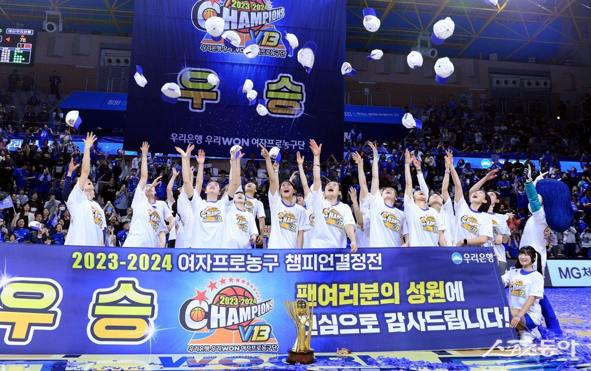 30일 충남 아산 이순신체육관에서 열린 ‘우리은행 우리 WON 2023-2024 여자프로농구’ 아산 우리은행과 청주 KB의 챔피언결정전 4차전 경기에서 우리은행이 KB를 꺾고 2년 연속 우승을 차지한 후 선수들이 모자를 벗어 세리머니를 펼치고 있다.