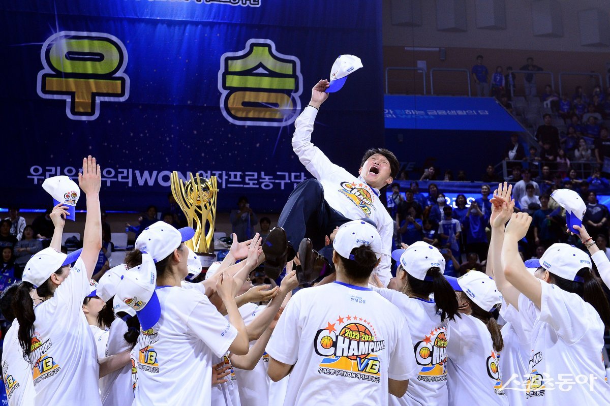30일 충남 아산 이순신체육관에서 열린 ‘우리은행 우리 WON 2023-2024 여자프로농구’ 아산 우리은행과 청주 KB의 챔피언결정전 4차전 경기에서 우리은행이 KB를 꺾고 2년 연속 우승을 차지한 후 선수들이 위성우 감독에게 우승 헹가래를 하고 있다.
