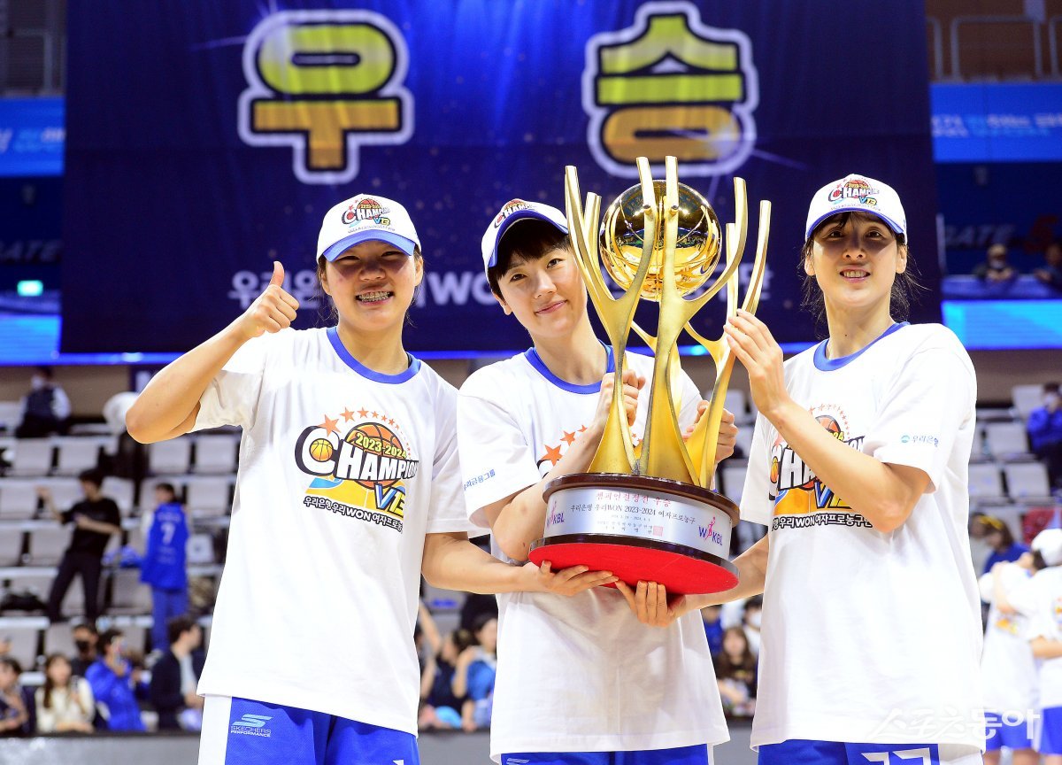30일 충남 아산 이순신체육관에서 열린 ‘우리은행 우리 WON 2023-2024 여자프로농구’ 아산 우리은행과 청주 KB의 챔피언결정전 4차전 경기에서 우리은행이 KB를 꺾고 2년 연속 우승을 차지한 후 우리은행 박지현, 박혜진, 김단비가 우승 트로피를 들고 기념촬영을 하고 있다.