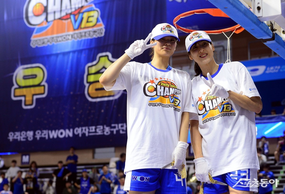 30일 충남 아산 이순신체육관에서 열린 ‘우리은행 우리 WON 2023-2024 여자프로농구’ 아산 우리은행과 청주 KB의 챔피언결정전 4차전 경기에서 우리은행이 KB를 꺾고 2년 연속 우승을 차지한 후 우리은행 김단비가 농구 림 컷팅에 앞서 동료와 기념촬영을 하고 있다.