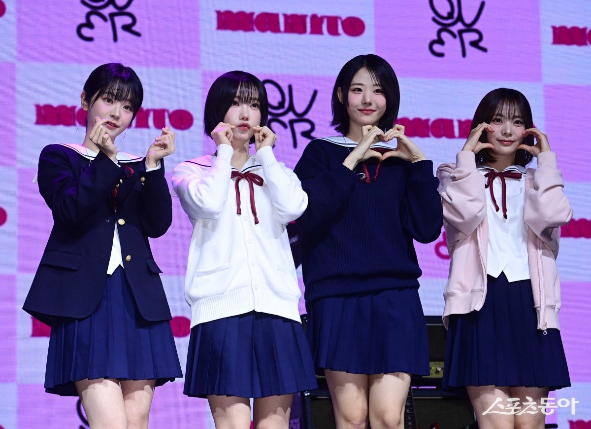 그룹 QWER이 1일 서울 서대문구 창천동 예스24 원더로크홀에서 열린 첫 번째 미니앨범 ‘Manito’ 발매 기념 프레스 쇼케이스에서 포즈를 취하고 있다.