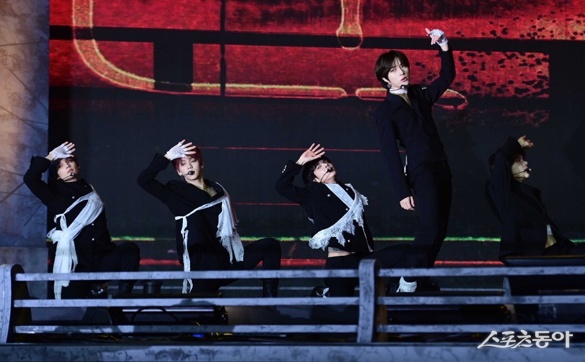 그룹 투모로우바이투게더가 1일 서울 성북구 안암동 고려대학교 화정체육관에서 열린 미니앨범 6집 ‘minisode 3: TOMORROW’ 발매 기념 프레스 쇼케이스에서 타이틀곡 ‘Deja Vu‘ 무대를 펼치고 있다.