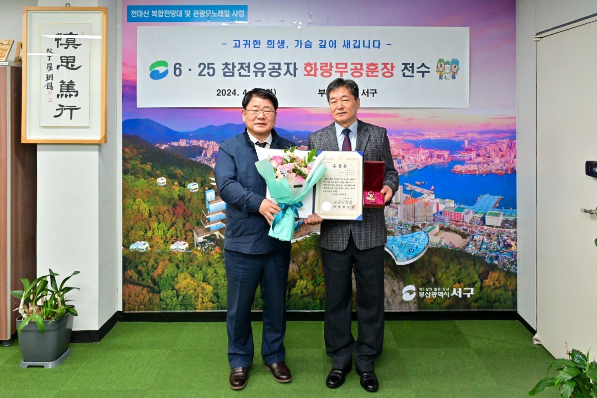 부산 서구(구청장 공한수)가 지난 2일 6.25전쟁에 참전해 공을 세운 고(故) 박린상 씨의 조카 박종대 씨에게 화랑무공훈장을 전수했다고 밝혔다.이는 ‘6·25참전유공자 무공훈장 찾아주기 사업’에 따른 것으로써 당시 전황으로 인해 훈장을 받지 못한 호국영웅을 발굴해 훈장을 전달하고 명예를 기리기 위한 것으로 지난 2019년부터 국방부와 육군본부에서 추진해 오고 있다.