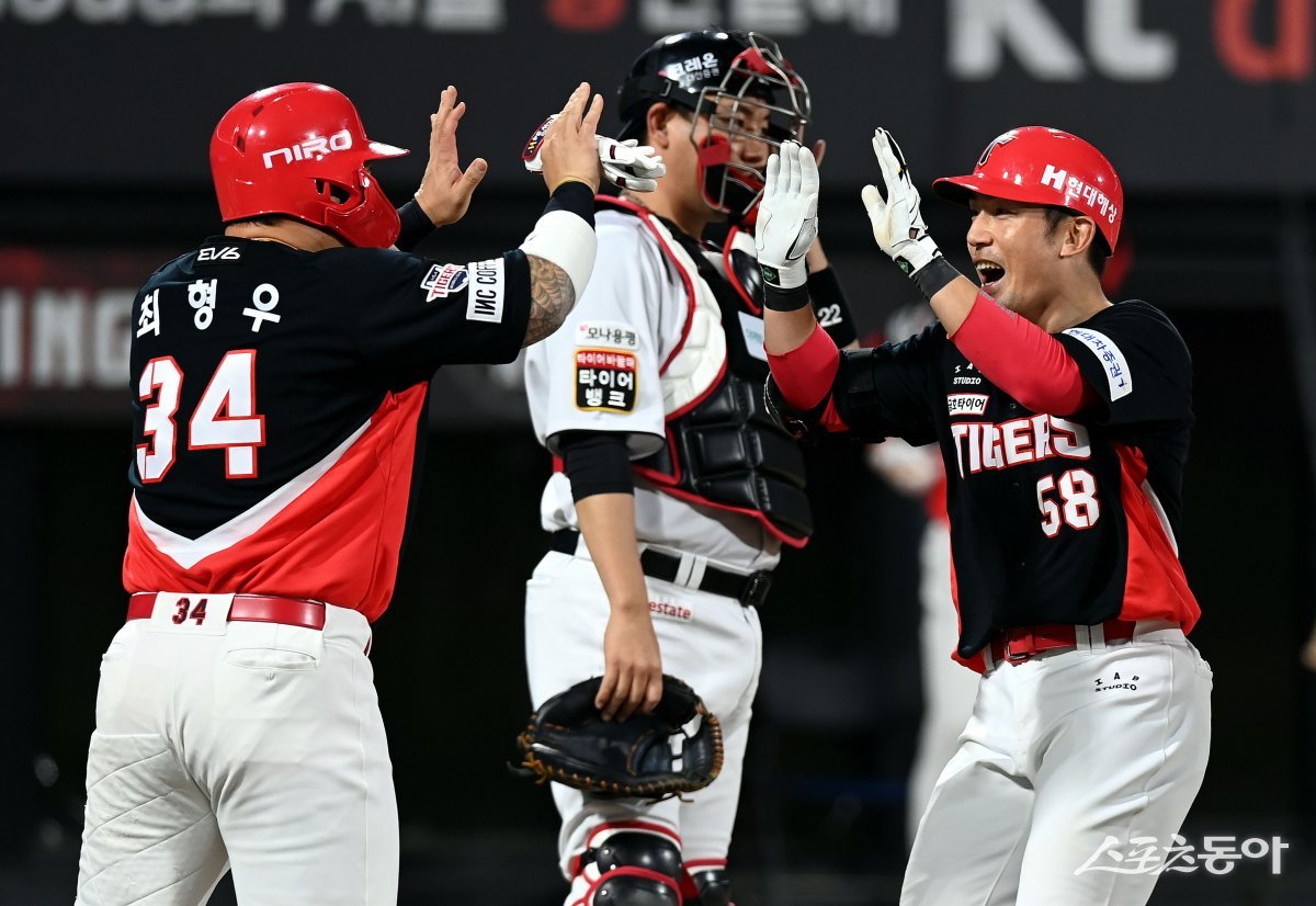 3일 경기도 수원 KT위즈파크에서 ‘2024 신한 SOL 뱅크 KBO리그’ KT 위즈와 KIA 타이거즈의 경기가 열렸다. 4회초 2사 1루에서 KIA 서건창이 투런 홈런을 쏘아 올린 후 최형우의 환영을 받고 있다.
