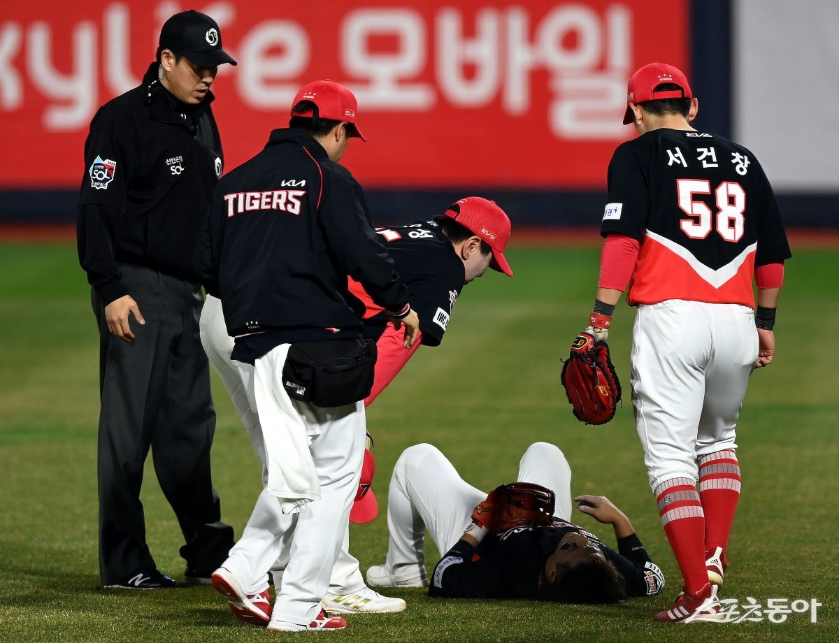 3일 경기도 수원 KT위즈파크에서 ‘2024 신한 SOL 뱅크 KBO리그’ KT 위즈와 KIA 타이거즈의 경기가 열렸다. 3회말 1사에서 KIA 김선빈이 플라이 타구를 잡은 후 그라운드에 쓰러져 있다.