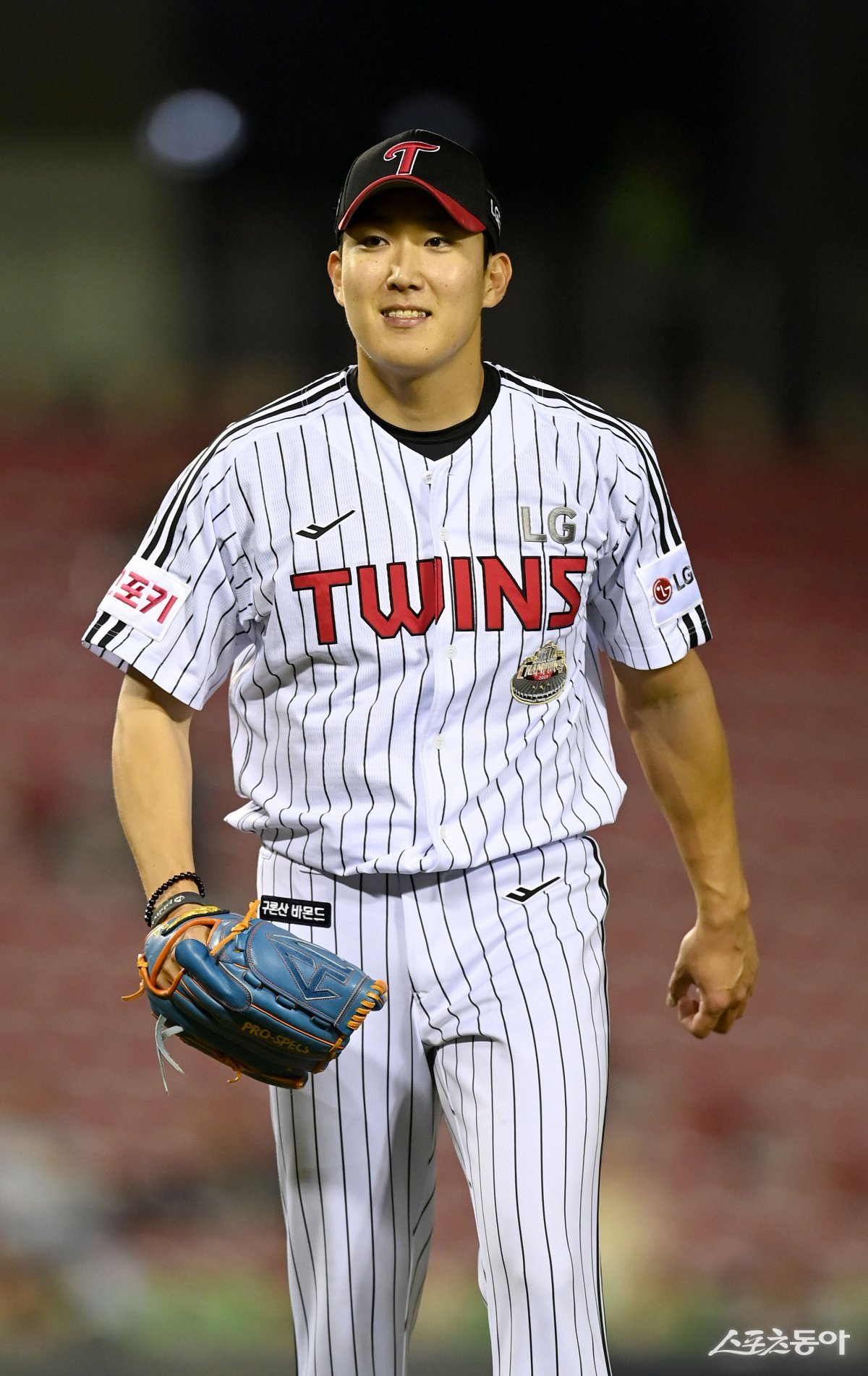 3일 서울 잠실야구장에서 ‘2024 신한은행 SOL뱅크 KBO리그’ NC 다이노스와 LG 트윈스 경기가 열렸다. 선발 투수로 등판한 LG 손주영이 3회초 투구를 마치고 웃으며 더그아웃으로 향하고 있다.
