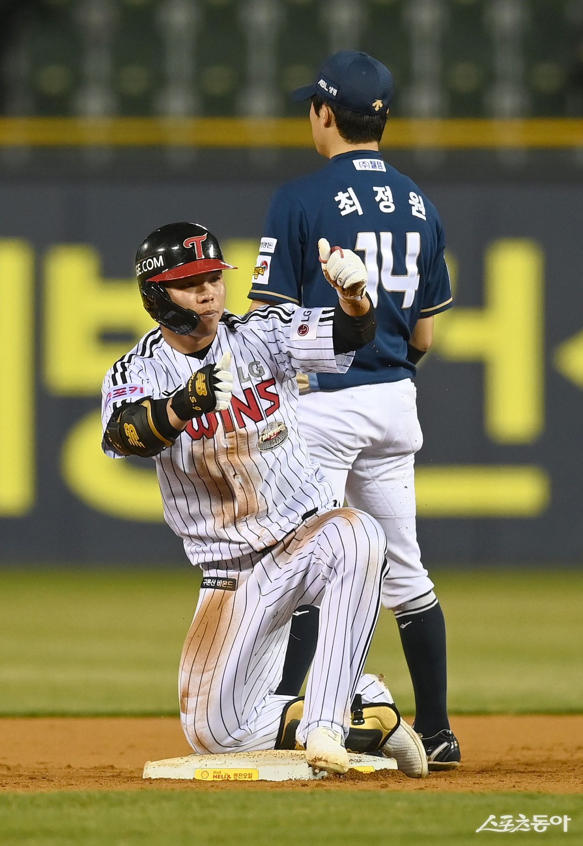 3일 서울 잠실야구장에서 ‘2024 신한은행 SOL뱅크 KBO리그’ NC 다이노스와 LG 트윈스 경기가 열렸다. 2회말 무사 중전 2루타를 치고 2루에서 기뻐하고 있다.