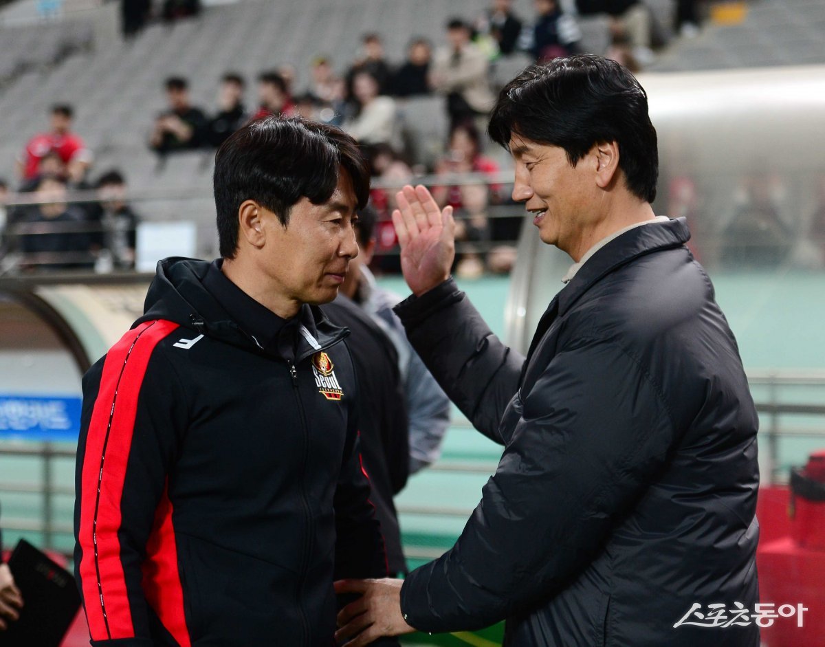 3일 서울월드컵경기장에서 열린 ‘하나은행 K리그1 2024’ FC서울과 김천 상무의 경기에 앞서 서울 김기동 감독과 김천 정정용 감독이 인사를 하고 있다.
