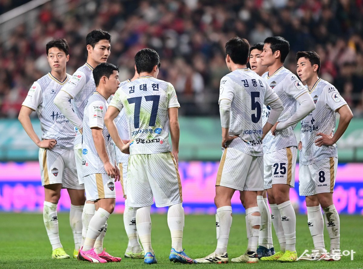 3일 서울월드컵경기장에서 열린 ‘하나은행 K리그1 2024’ FC서울과 김천 상무의 경기에서 서울에 세 번째 골을 허용한 김천 선수들이 이야기를 하고 있다.