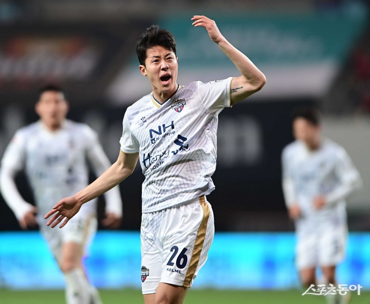 3일 서울월드컵경기장에서 열린 ‘하나은행 K리그1 2024’ FC서울과 김천 상무의 경기에서 김천 김민준이 첫 번째 골을 성공시킨 후 세리머니를 하고 있다.