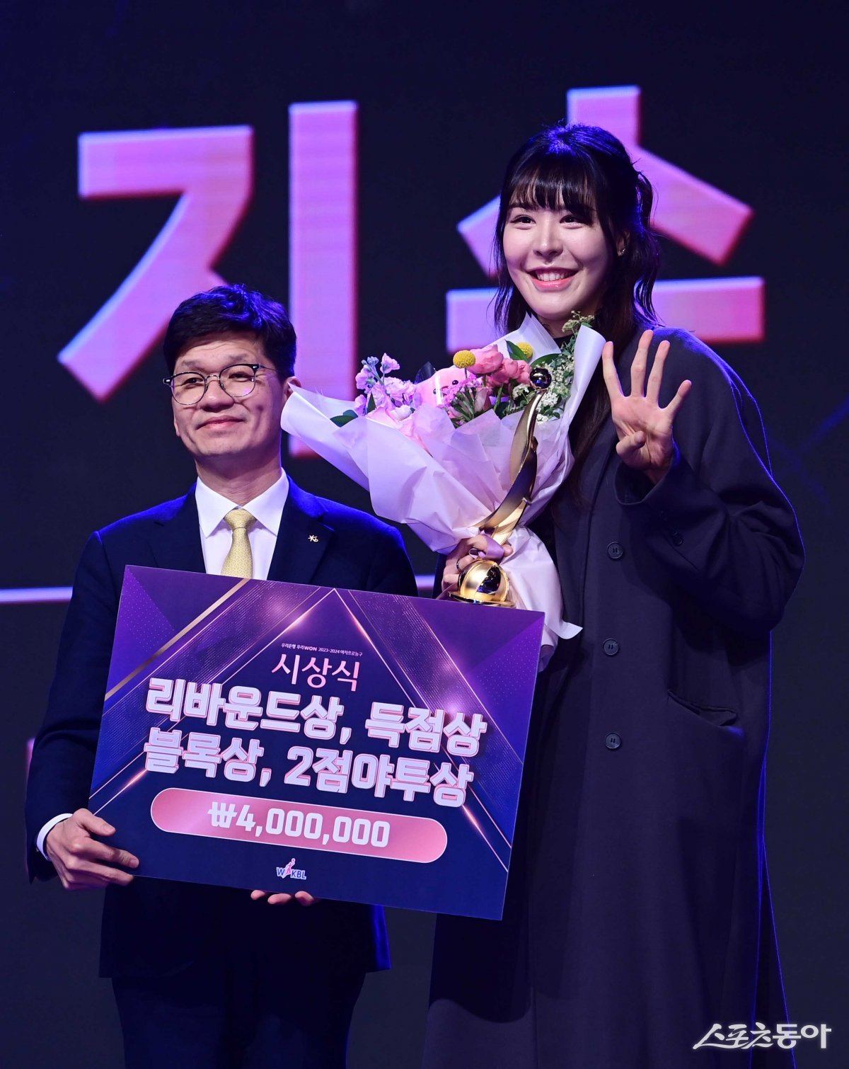 4일 서울 영등포구 여의도동 63컨벤션센터에서 열린 ‘우리은행 우리WON 2023-2024 여자프로농구’ 시상식에서 통계 부문 득점상, 리바운드상, 블록상, 2점야투상을 수상한 KB 박지수가 기념 촬영을 하고 있다.