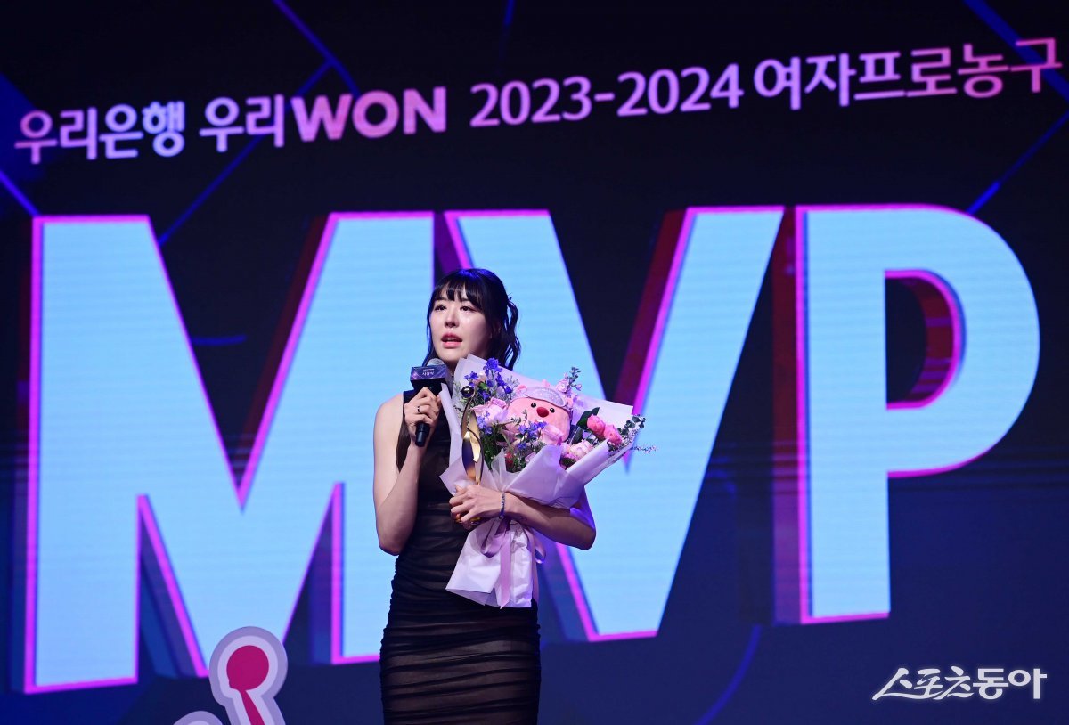 4일 서울 영등포구 여의도동 63컨벤션센터에서 열린 ‘우리은행 우리WON 2023-2024 여자프로농구’ 시상식에서 투표 부문 정규리그 MVP를 수상한 KB 박지수가 소감을 말하고 있다.