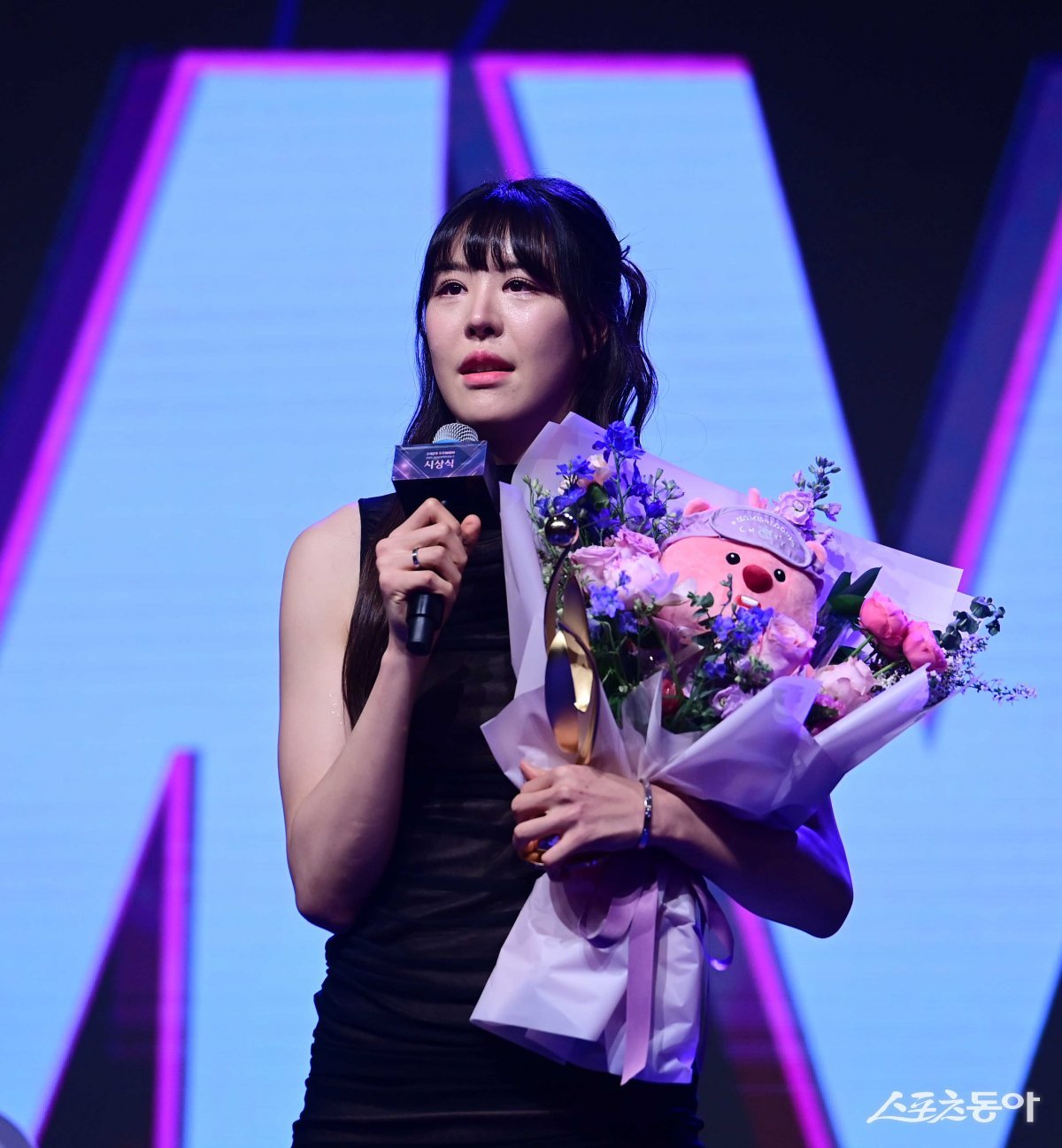 4일 서울 영등포구 여의도동 63컨벤션센터에서 열린 ‘우리은행 우리WON 2023-2024 여자프로농구’ 시상식에서 투표 부문 정규리그 MVP를 수상한 KB 박지수가 소감을 말하고 있다.