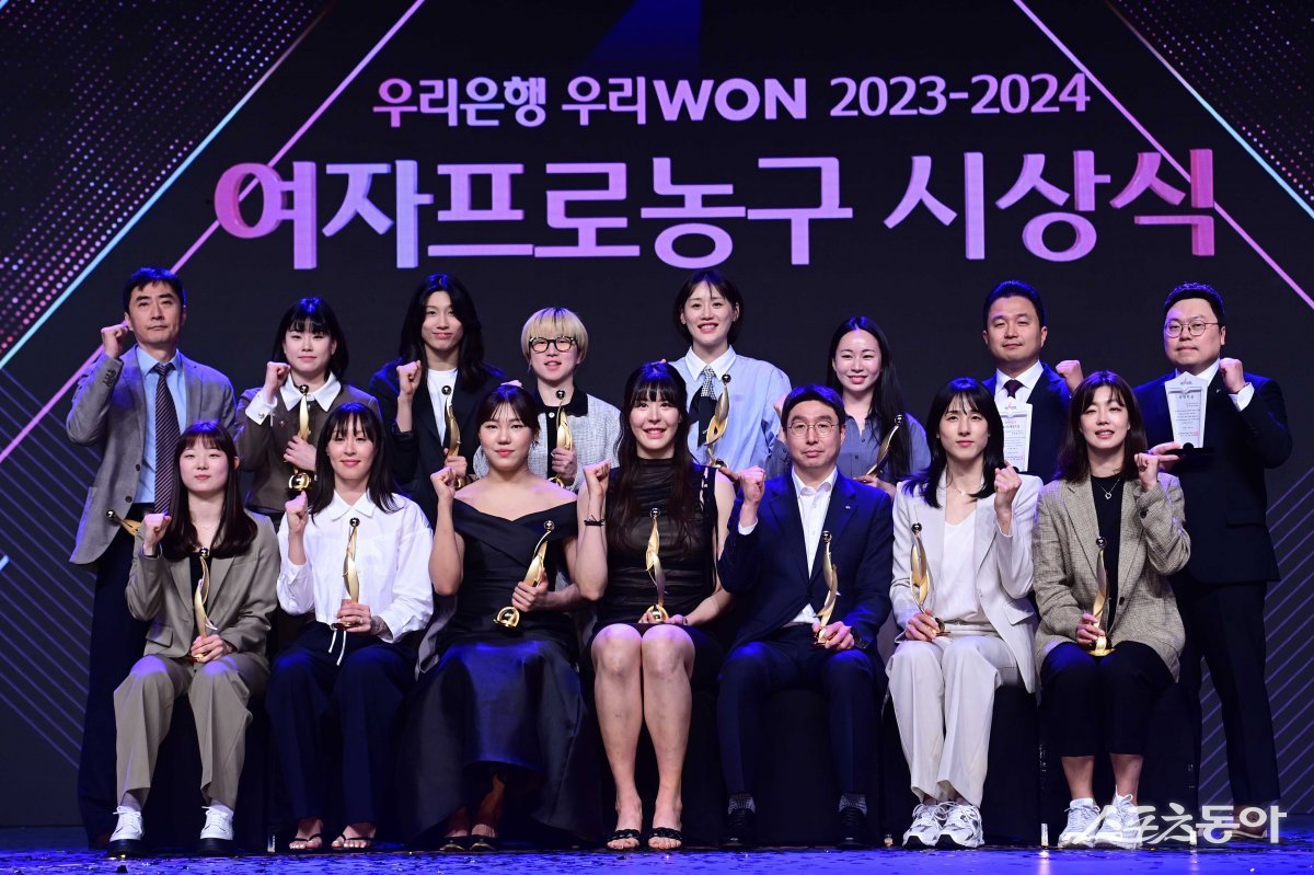 4일 서울 영등포구 여의도동 63컨벤션센터에서 열린 ‘우리은행 우리WON 2023-2024 여자프로농구’ 시상식에서 수상한 류상호 심판, BNK 이소희, 삼성생명 이해란, BNK 안혜지, KB 강이슬, 삼성생명 키아나 스미스 대리 수상한 류해림 통역, 신한은행 방영범 사무국장, 하나원큐 김기림 사무국장, 신한은행 이경은, 우리은행 김단비, KB 김완수 감독, 박지수, 우리은행 박지현, 신한은행 김소니아, KB 허예은(윗줄 왼쪽에서 시계 방향으로)이 기념 촬영을 하고 있다.