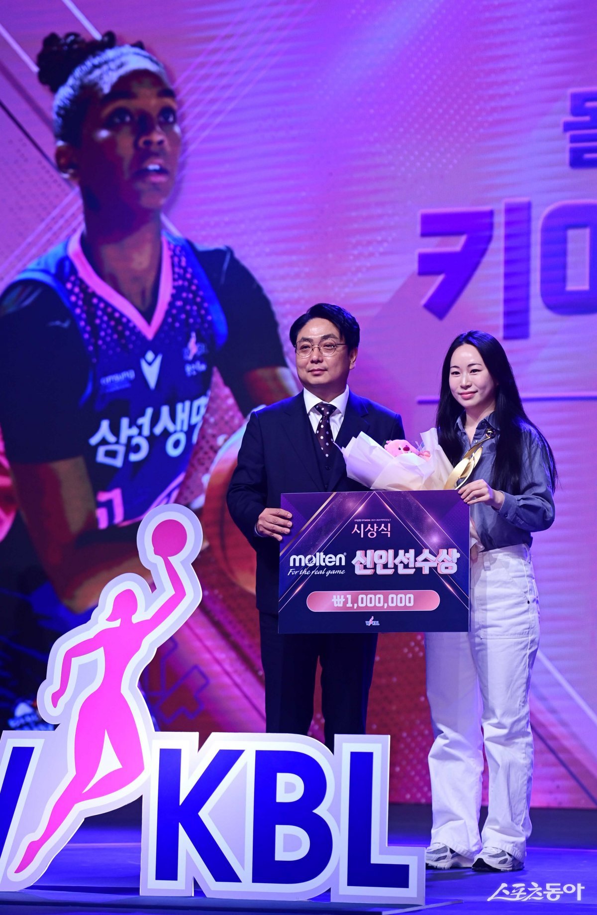 4일 서울 영등포구 여의도동 63컨벤션센터에서 열린 ‘우리은행 우리WON 2023-2024 여자프로농구’ 시상식에서 투표 부문 몰텐 신인선수상을 수상한 삼성생명 키아나 스미스를 대신해 류해림 통역이 기념 촬영을 하고 있다.