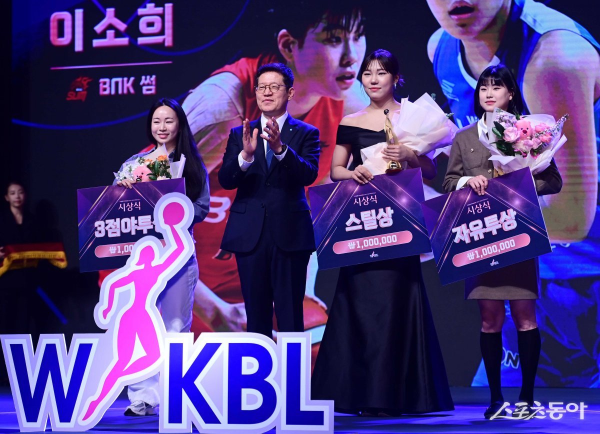 4일 서울 영등포구 여의도동 63컨벤션센터에서 열린 ‘우리은행 우리WON 2023-2024 여자프로농구’ 시상식에서 통계 부문 3점야투상을 수상한 삼성생명 키아나 스미스를 대신해 류해림 통역, 스틸상을 수상한 우리은행 박지현, 자유투상을 수상한 BNK 이소희가 기념 촬영을 하고 있다.