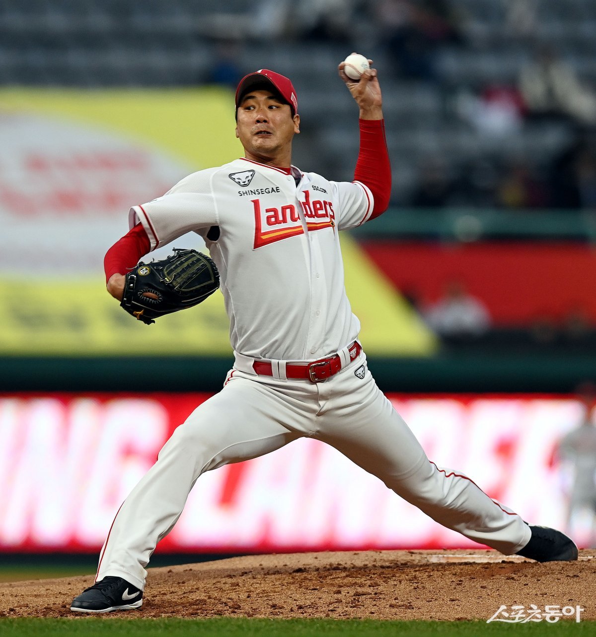 4일 인천 SSG 랜더스필드에서 ‘2024 신한 SOL 뱅크 KBO리그’ SSG 랜더스와 두산 베어스의 경기가 열렸다. SSG 선발투수 김광현이 힘차게 볼을 던지고 있다.