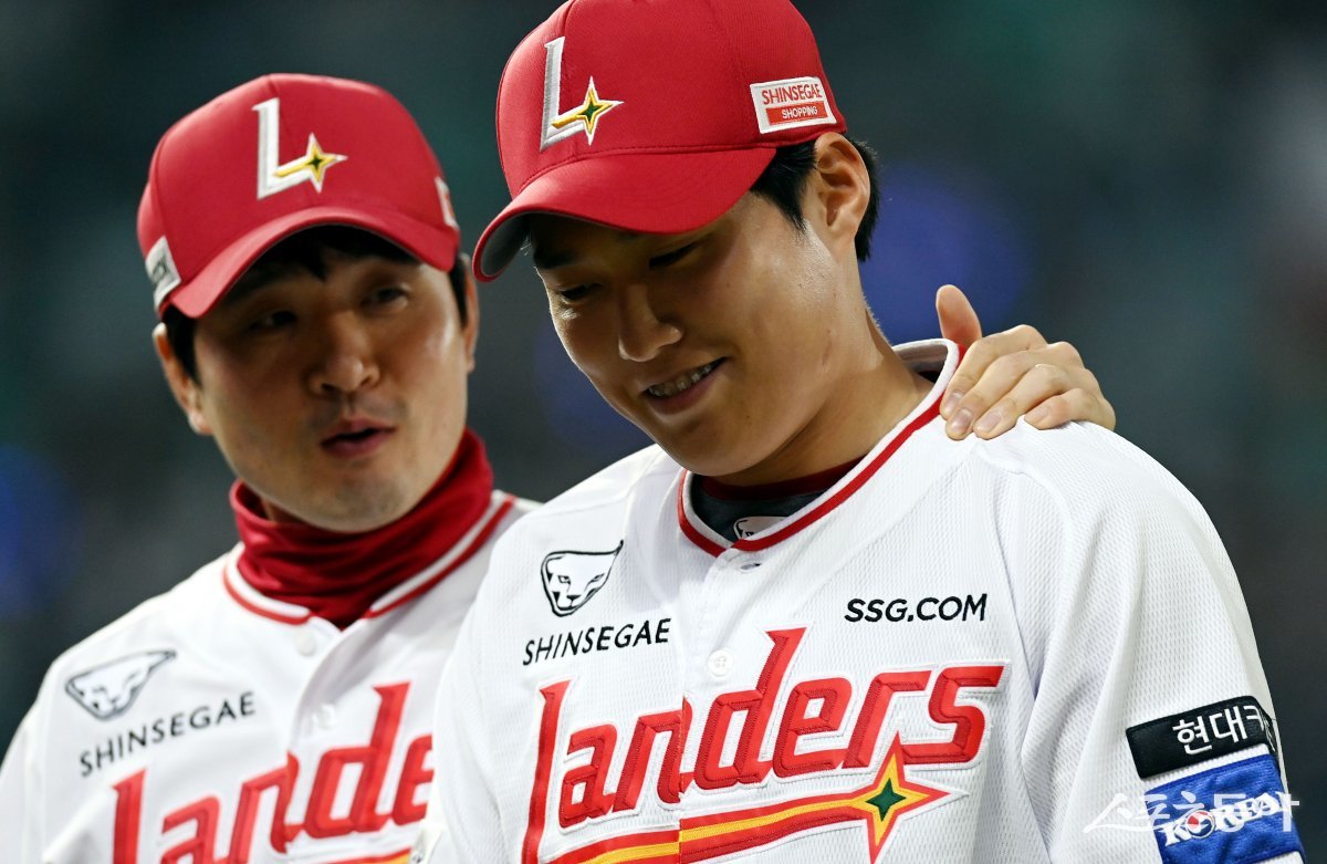 4일 인천 SSG 랜더스필드에서 ‘2024 신한 SOL 뱅크 KBO리그’ SSG 랜더스와 두산 베어스의 경기가 열렸다. 5회말 이닝 종료 후 SSG 최민준이 더그아웃으로 향하며 김성현과 이야기를 나누고 있다.