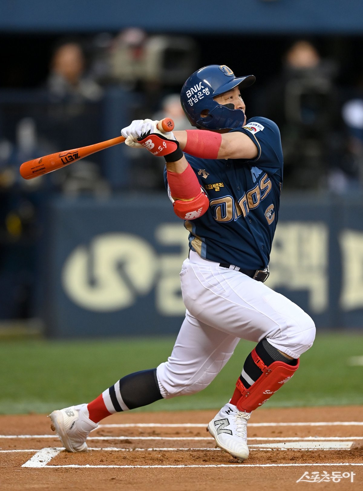 4일 서울 잠실야구장에서 ‘2024 신한은행 SOL뱅크 KBO리그’ NC 다이노스와 LG 트윈스 경기가 열렸다. 1회초 1사 1루 NC 손아섭이 중전 안타를 치고 있다.