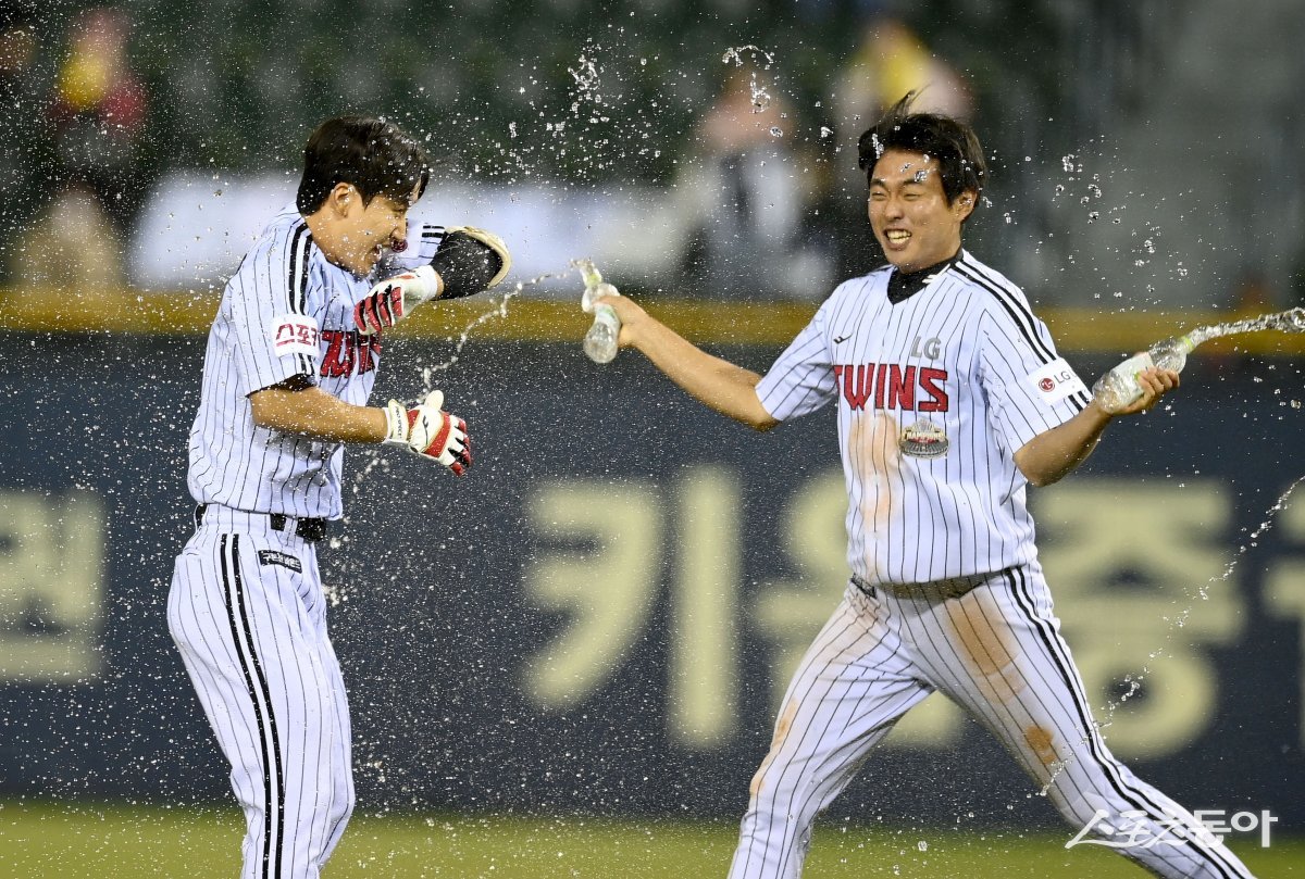 4일 서울 잠실야구장에서 ‘2024 신한은행 SOL뱅크 KBO리그’ NC 다이노스와 LG 트윈스 경기가 열렸다. 연장 11회말 1사 2,3루 LG 구본혁이 끝내기 안타를 치고 동료들의 축하를 받고 있다.