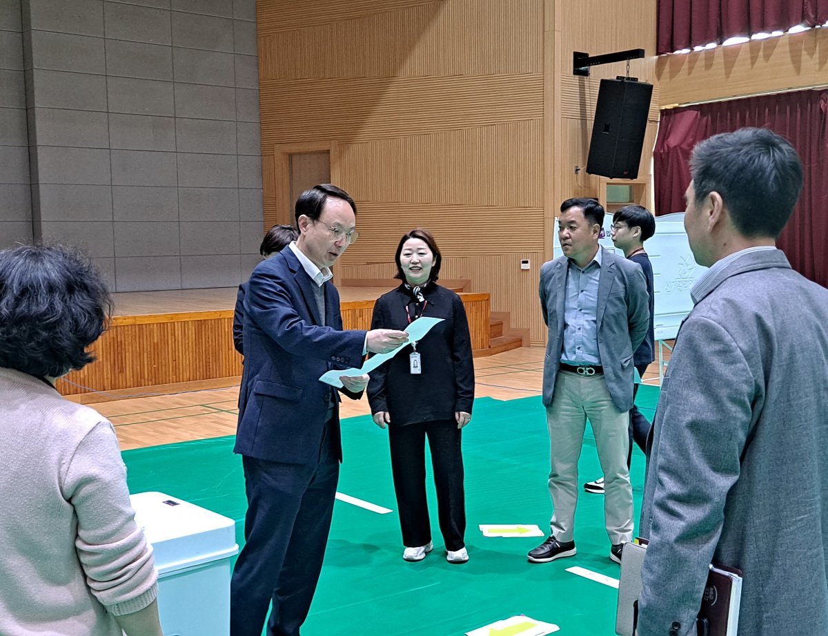 이현호 포천시부시장(윈쪽 두번째)이 4일 포천동 사전투표소 등 관내 5개 사전투표소의 현장을 점검하고 있다. 사진제공 ㅣ포천시
