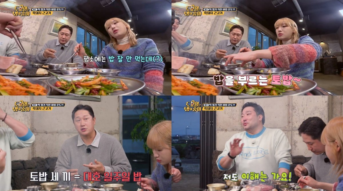 이대호의 맛깔난 공깃밥 먹방에 히밥도 흔들렸다. 추가로 공깃밥과 모둠 고기 한 근을 주문한 히밥은 "평소에는 밥을 자주 안 먹는데 \'토밥\'만 오면 밥을 많이 먹는다. 평소에는 공깃밥 추가 잘 안 하는 편"이라며 고개를 갸우뚱했다.