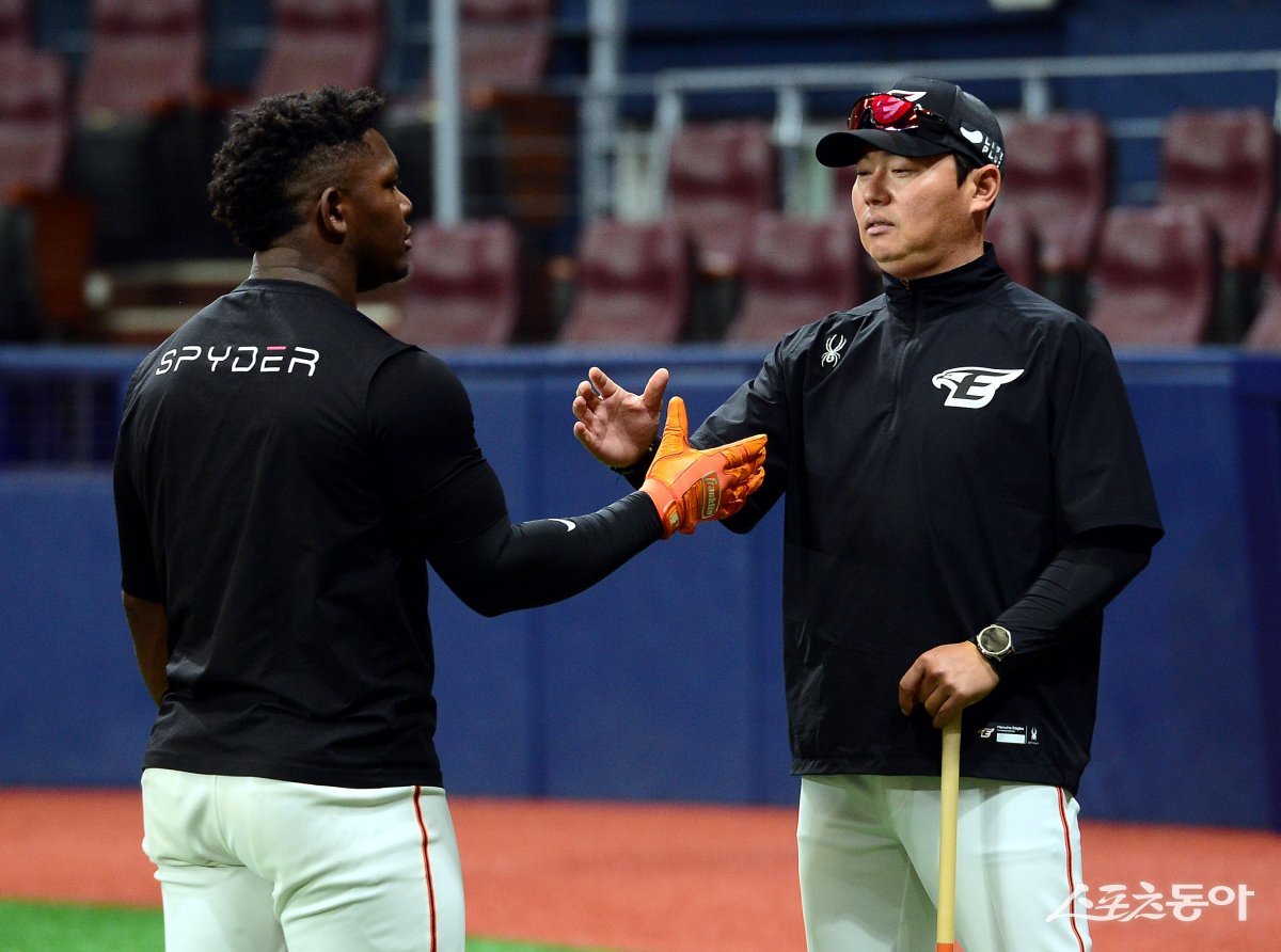 7일 서울 고척스카이돔에서 ‘2024 신한 SOL 뱅크 KBO리그’ 키움 히어로즈와 한화 이글스의 경기가 열린다. 경기 전 한화 박재상 코치가 페라자와 악수를 나누고 있다.
