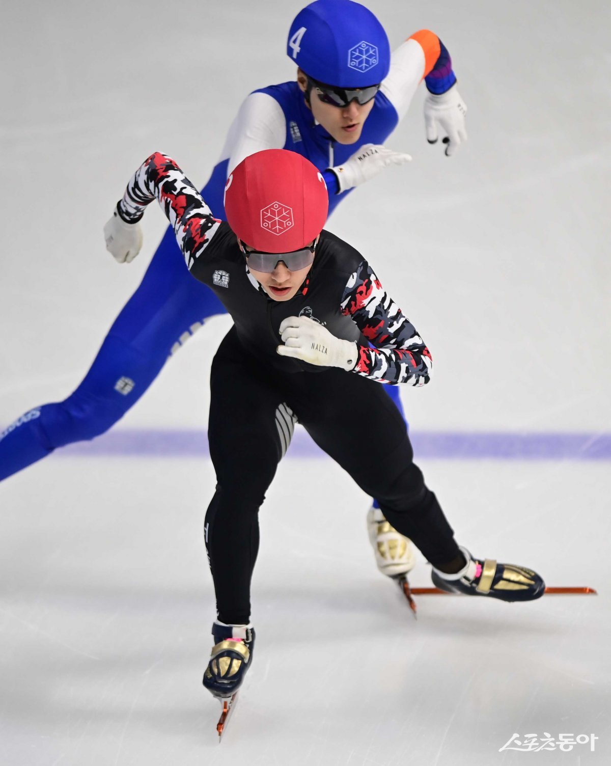 7일 서울 목동아이스링크에서 열린 ‘2024/25시즌 쇼트트랙 국가대표 1차 선발대회’ 남자 1000m 준준결승전 경기에서 서울시청 박지워이 한승수의 스케이트 날에 걸리고 있다.