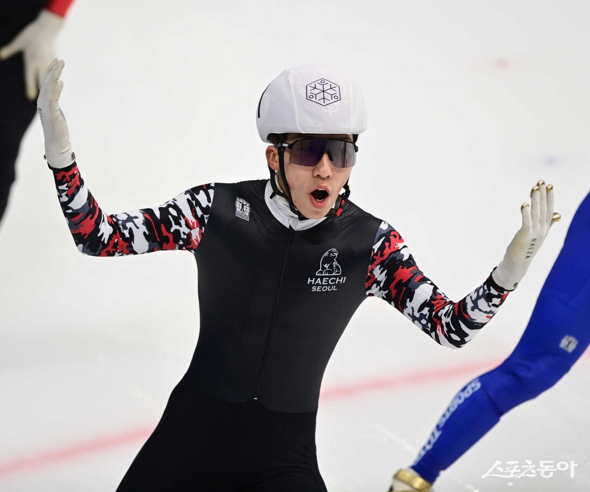 7일 서울 목동아이스링크에서 열린 ‘2024/25시즌 쇼트트랙 국가대표 1차 선발대회’ 남자 1000m 준결승전 경기에서 1위로 통과한 서울시청 박지원이 기뻐하고 있다.
