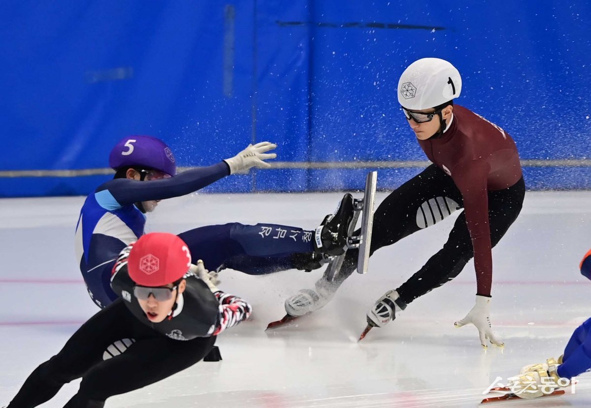 7일 서울 목동아이스링크에서 열린 ‘2024/25시즌 쇼트트랙 국가대표 1차 선발대회’ 남자 1000m 준준결승전 경기에서 성남시청 서범석이 넘어지며 고려대 장성우와 충돌하고 있다.