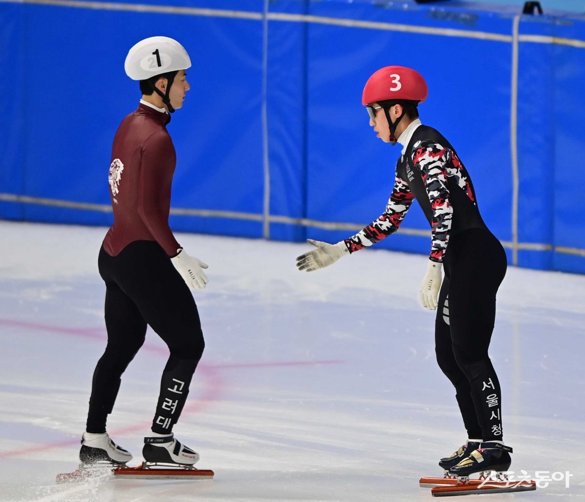 7일 서울 목동아이스링크에서 열린 ‘2024/25시즌 쇼트트랙 국가대표 1차 선발대회’ 남자 1000m 준준결승전 경기에서 충돌로 넘어진 후 완주한 고려대 장성우를 서울시청 박지원이 격려하고 있다.