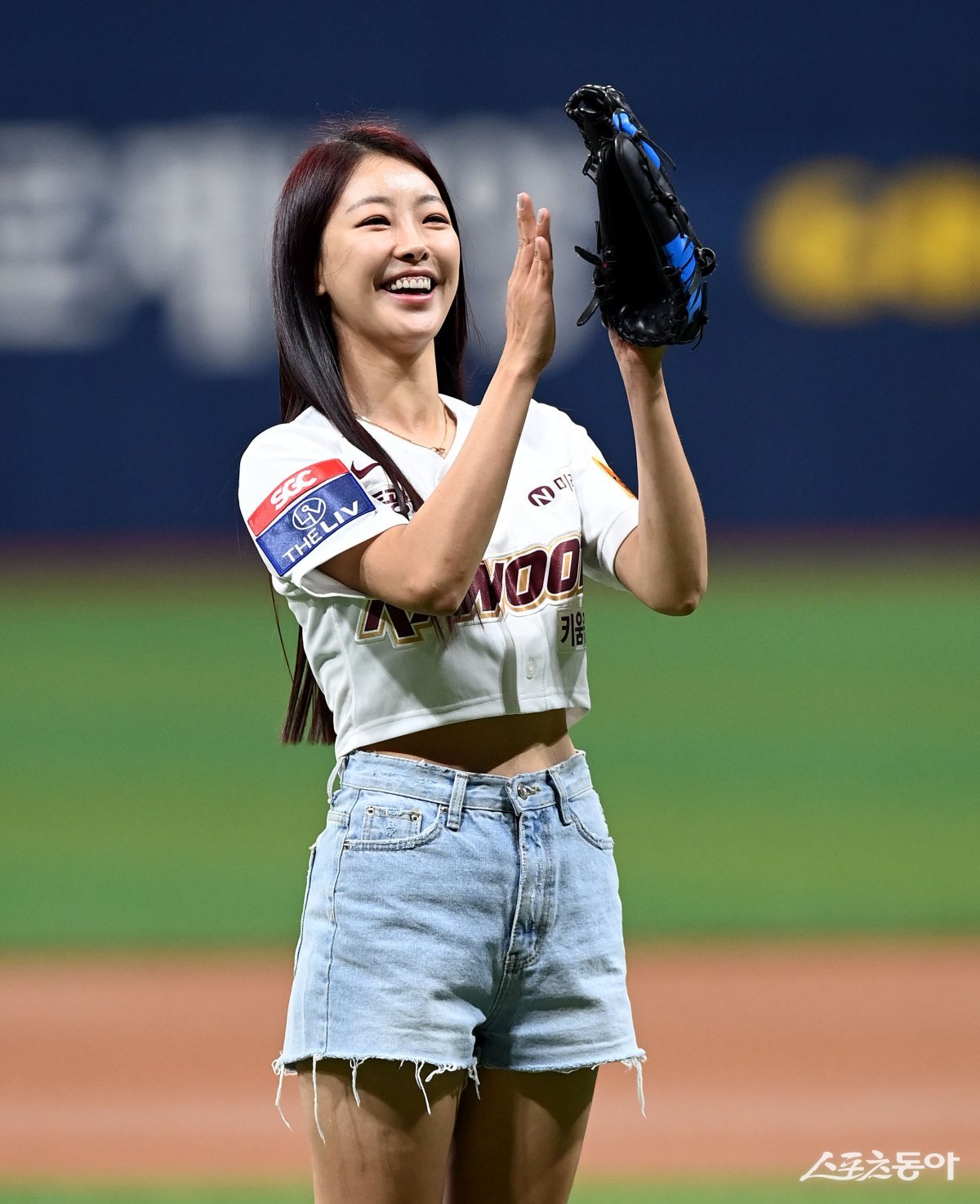 7일 서울 고척스카이돔에서 ‘2024 신한 SOL 뱅크 KBO리그’ 키움 히어로즈와 한화 이글스의 경기가 열렸다. 배우 고원희가 키움 승리기원 시구를 하고 있다.