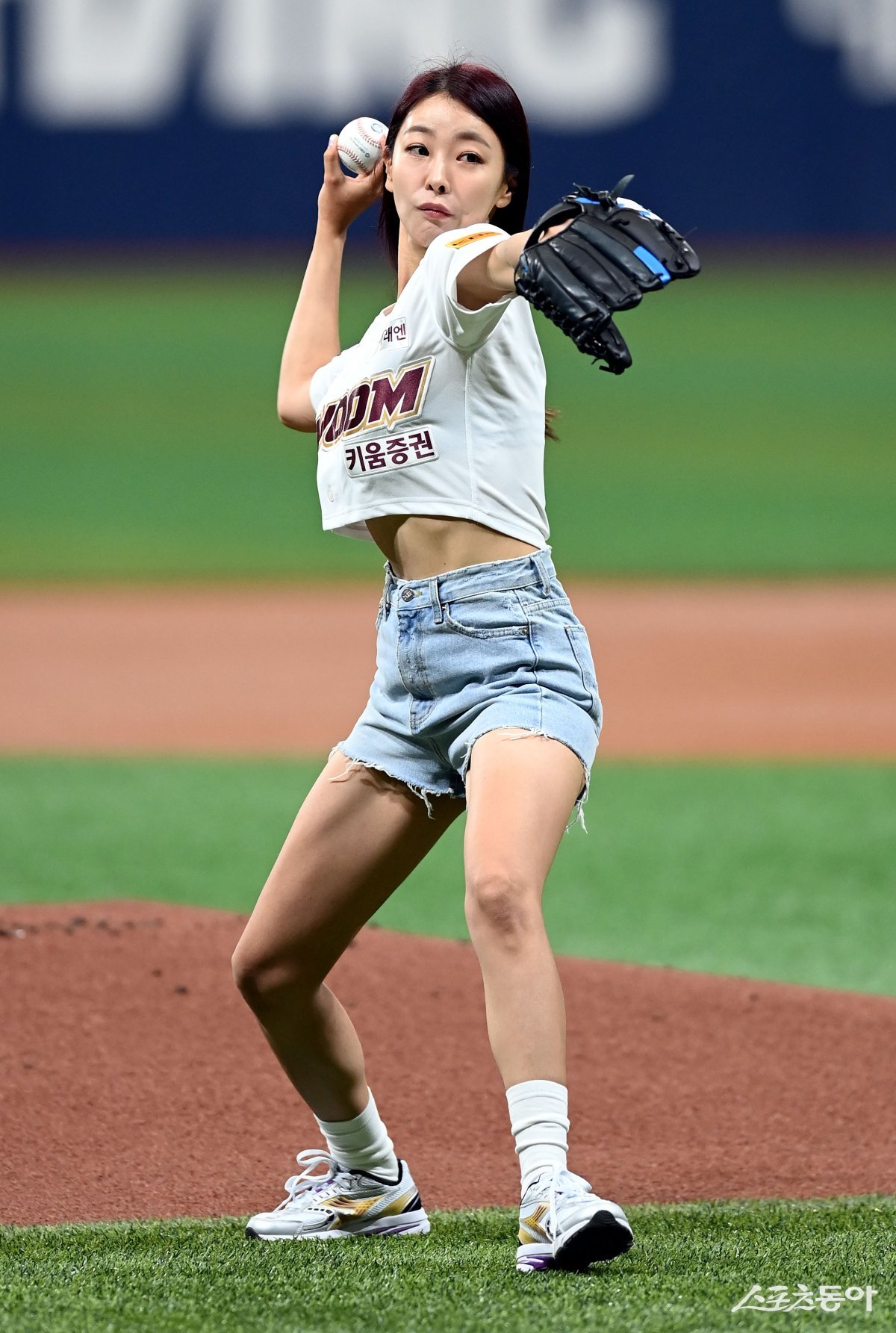 7일 서울 고척스카이돔에서 ‘2024 신한 SOL 뱅크 KBO리그’ 키움 히어로즈와 한화 이글스의 경기가 열렸다. 배우 고원희가 키움 승리기원 시구를 하고 있다.
