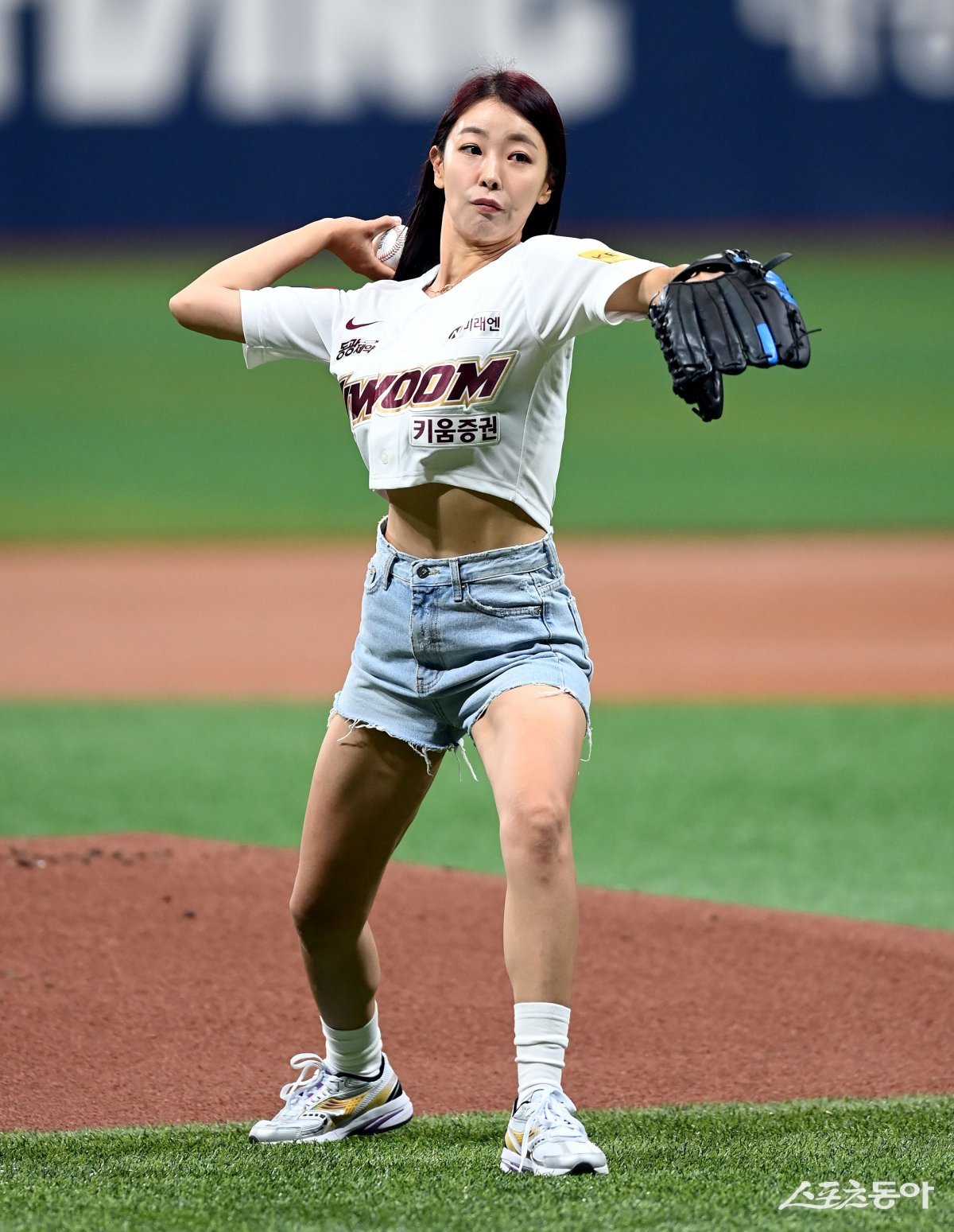 7일 서울 고척스카이돔에서 ‘2024 신한 SOL 뱅크 KBO리그’ 키움 히어로즈와 한화 이글스의 경기가 열렸다. 배우 고원희가 키움 승리기원 시구를 하고 있다.