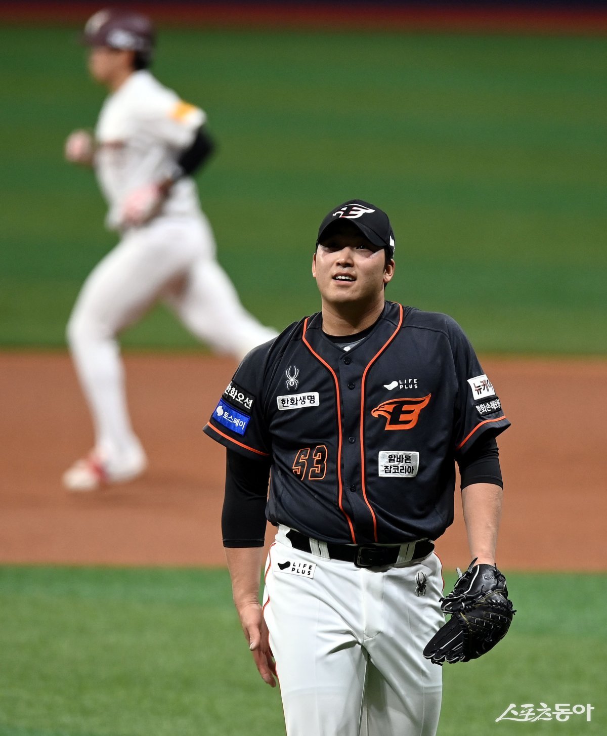 7일 서울 고척스카이돔에서 ‘2024 신한 SOL 뱅크 KBO리그’ 키움 히어로즈와 한화 이글스의 경기가 열렸다. 1회말 2사에서 한화 선발 김민우가 솔로 홈런을 허용 후 아쉬워하고 있다.