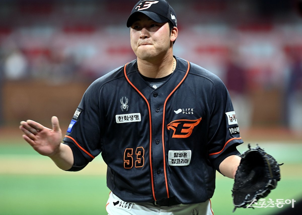 7일 서울 고척스카이돔에서 ‘2024 신한 SOL 뱅크 KBO리그’ 키움 히어로즈와 한화 이글스의 경기가 열렸다. 한화 선발투수 김민우가 5회까지 키움 공격을 1실점으로 막은 후 더그아웃으로 향하며 환호하고 있다.