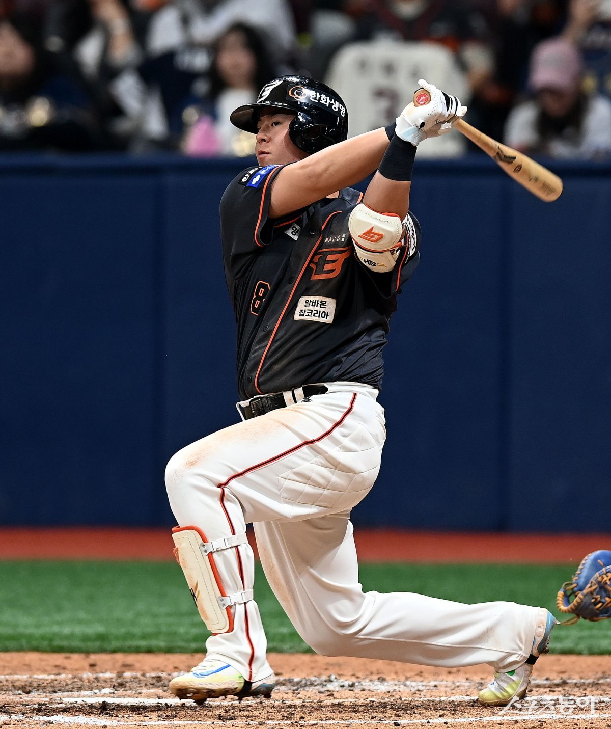 7일 서울 고척스카이돔에서 ‘2024 신한 SOL 뱅크 KBO리그’ 키움 히어로즈와 한화 이글스의 경기가 열렸다. 7회초 1사에서 한화 노시환이 안타를 날리고 있다.