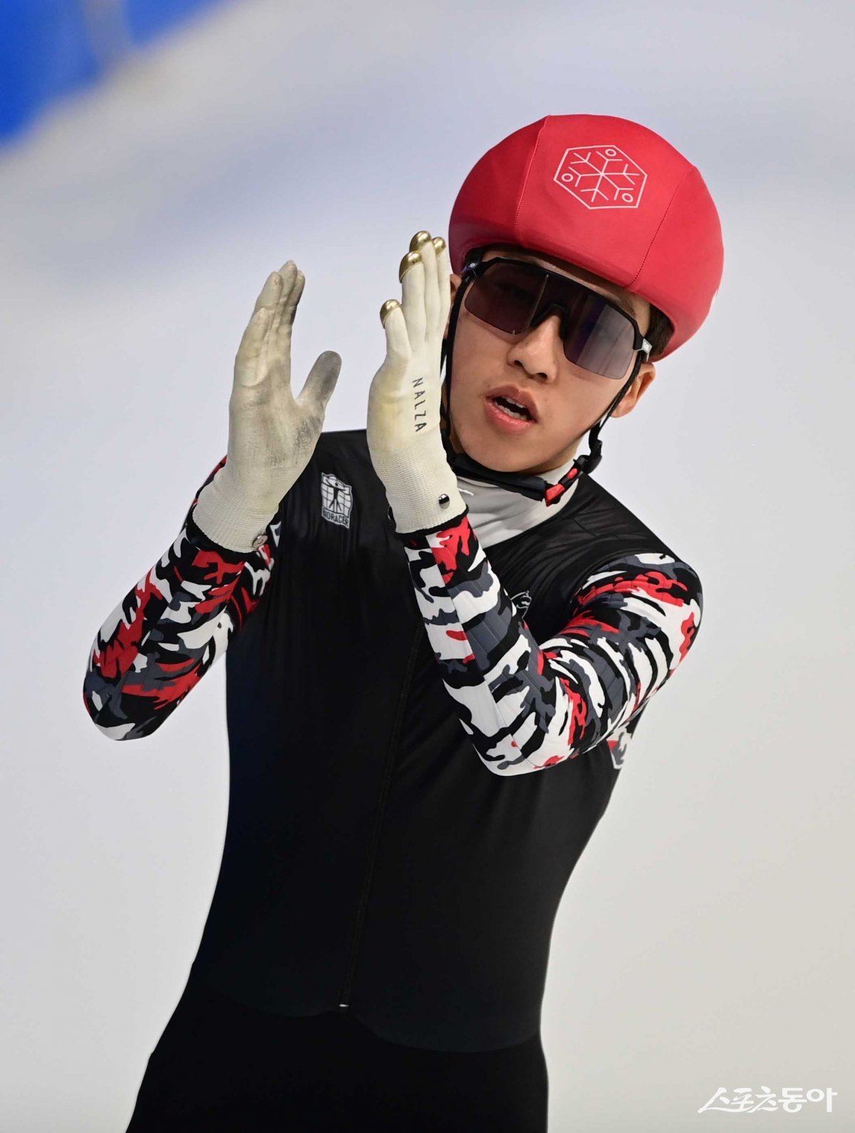 7일 서울 목동아이스링크에서 열린 ‘2024/25시즌 쇼트트랙 국가대표 1차 선발대회’ 남자 1000m 결승전 경기에서 1위를 차지한 서울시청 박지원이 팬들에게 인사하고 있다.