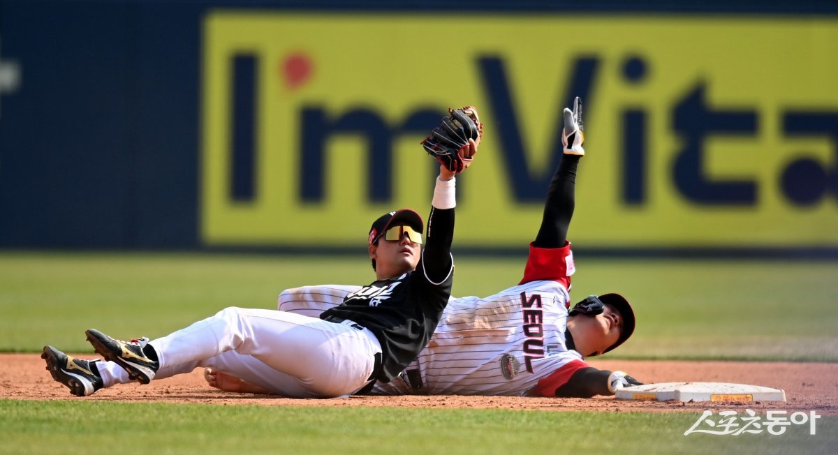 7일 서울 잠실야구장에서 ‘2024 신한은행 SOL뱅크 KBO리그’ KT 위즈와 LG 트윈스 경기가 열렸다. 4회말 무사 1,2루 LG 2루주자 문보경이 포수 견제 아웃되고 있다.