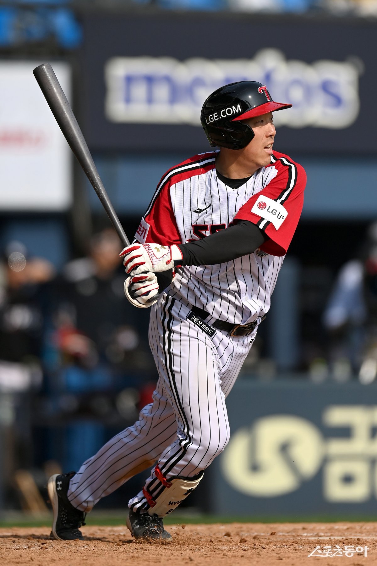 7일 서울 잠실야구장에서 ‘2024 신한은행 SOL뱅크 KBO리그’ KT 위즈와 LG 트윈스 경기가 열렸다. 5회말 1사 1,2루 LG 김현수가 1타점 중전 안타를 치고 있다.