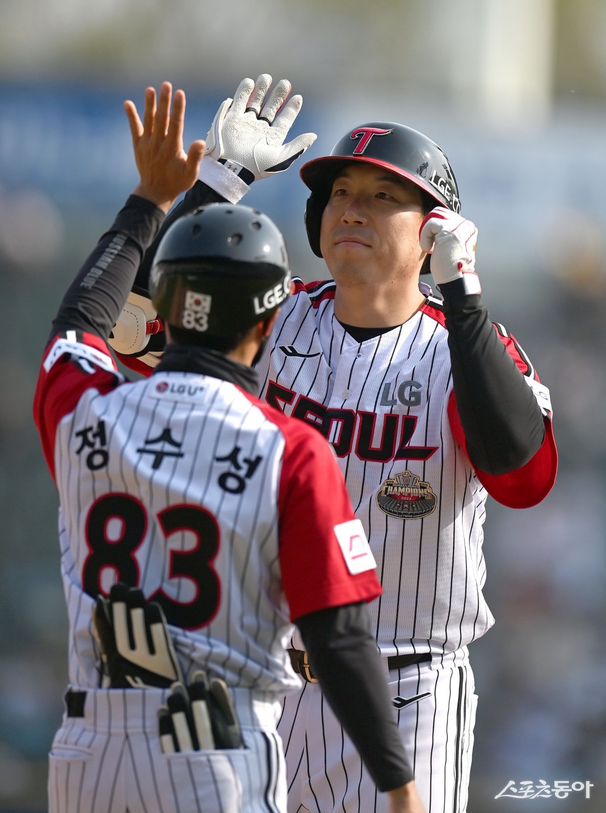 7일 서울 잠실야구장에서 ‘2024 신한은행 SOL뱅크 KBO리그’ KT 위즈와 LG 트윈스 경기가 열렸다. 5회말 1사 1,2루 LG 김현수가 1타점 중전 안타를 치고 1루에서 하이파이브 하고 있다.