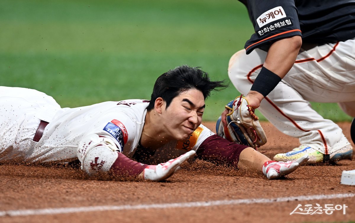 7일 서울 고척스카이돔에서 ‘2024 신한 SOL 뱅크 KBO리그’ 키움 히어로즈와 한화 이글스의 경기가 열렸다. 연장 10회말 1사에서 키움 이주형이 2루타를 날린 후 3루까지 달렸으나 태그 아웃되고 있다.