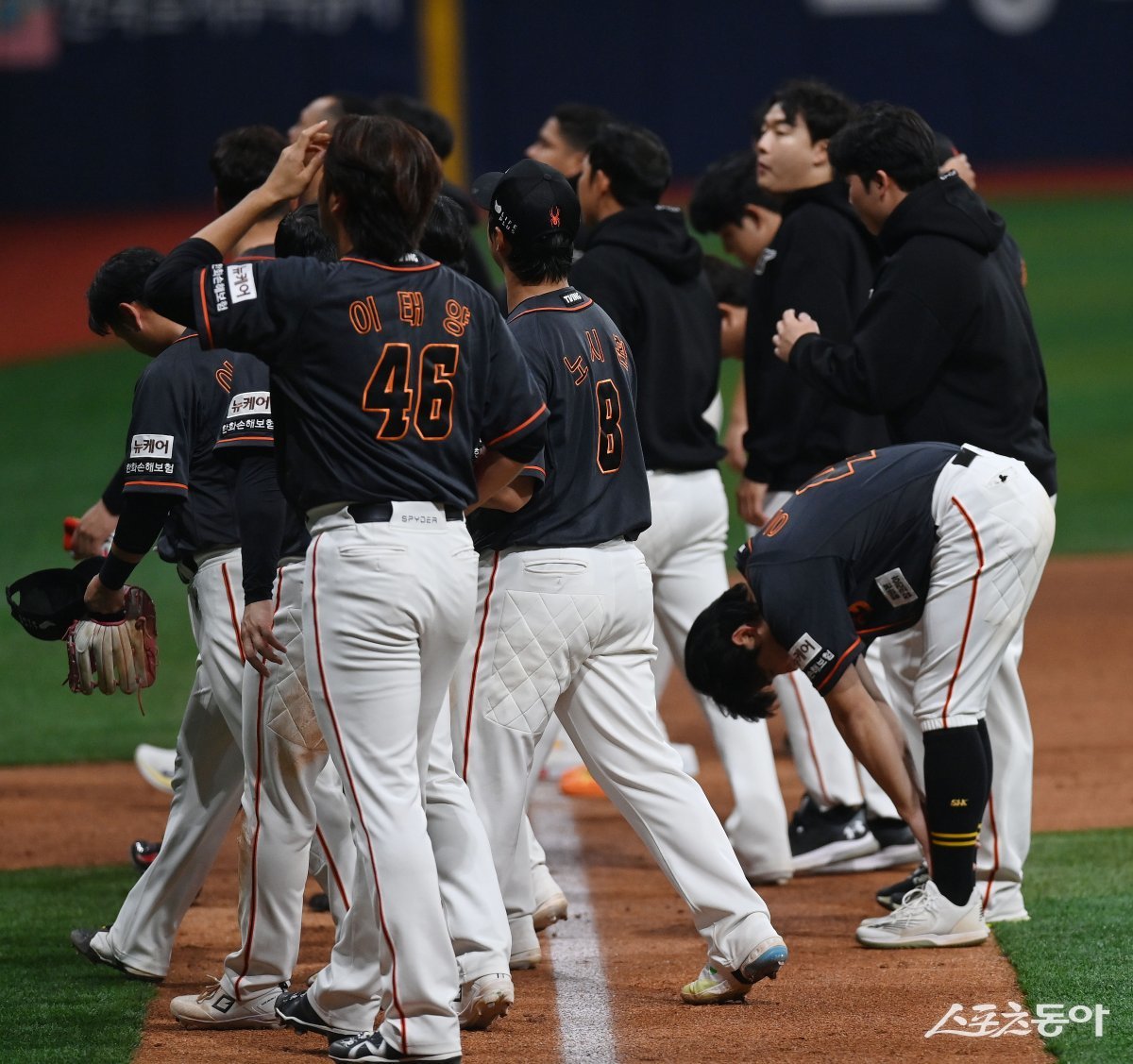 7일 서울 고척스카이돔에서 ‘2024 신한 SOL 뱅크 KBO리그’ 키움 히어로즈와 한화 이글스의 경기가 열렸다. 연장 11회말 무사에서 끝내기 홈런을 허용하며 패배한 한화 선수들이 그라운드를 빠져나가고 있다.