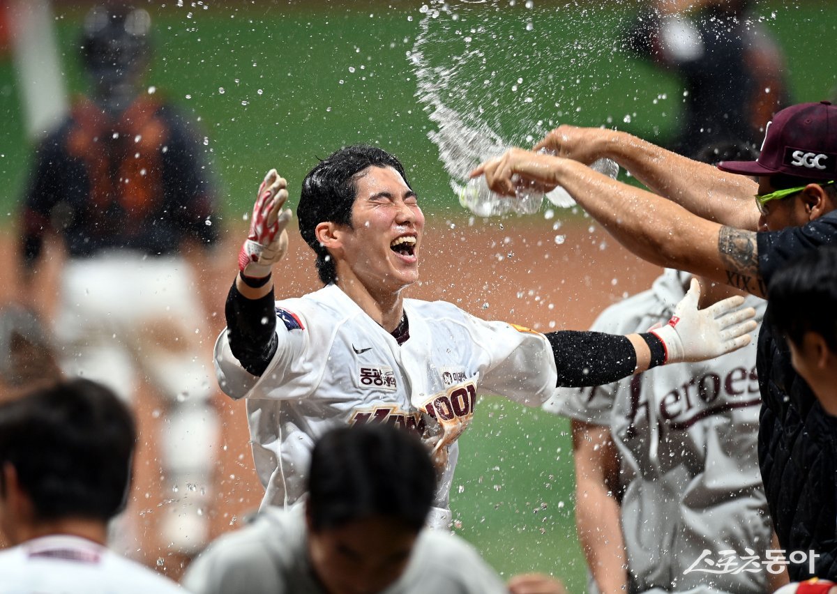 7일 서울 고척스카이돔에서 ‘2024 신한 SOL 뱅크 KBO리그’ 키움 히어로즈와 한화 이글스의 경기가 열렸다. 연장 11회말 무사에서 키움 김혜성이 끝내기 홈런을 쏘아 올린 후 물세례를 받고 있다.