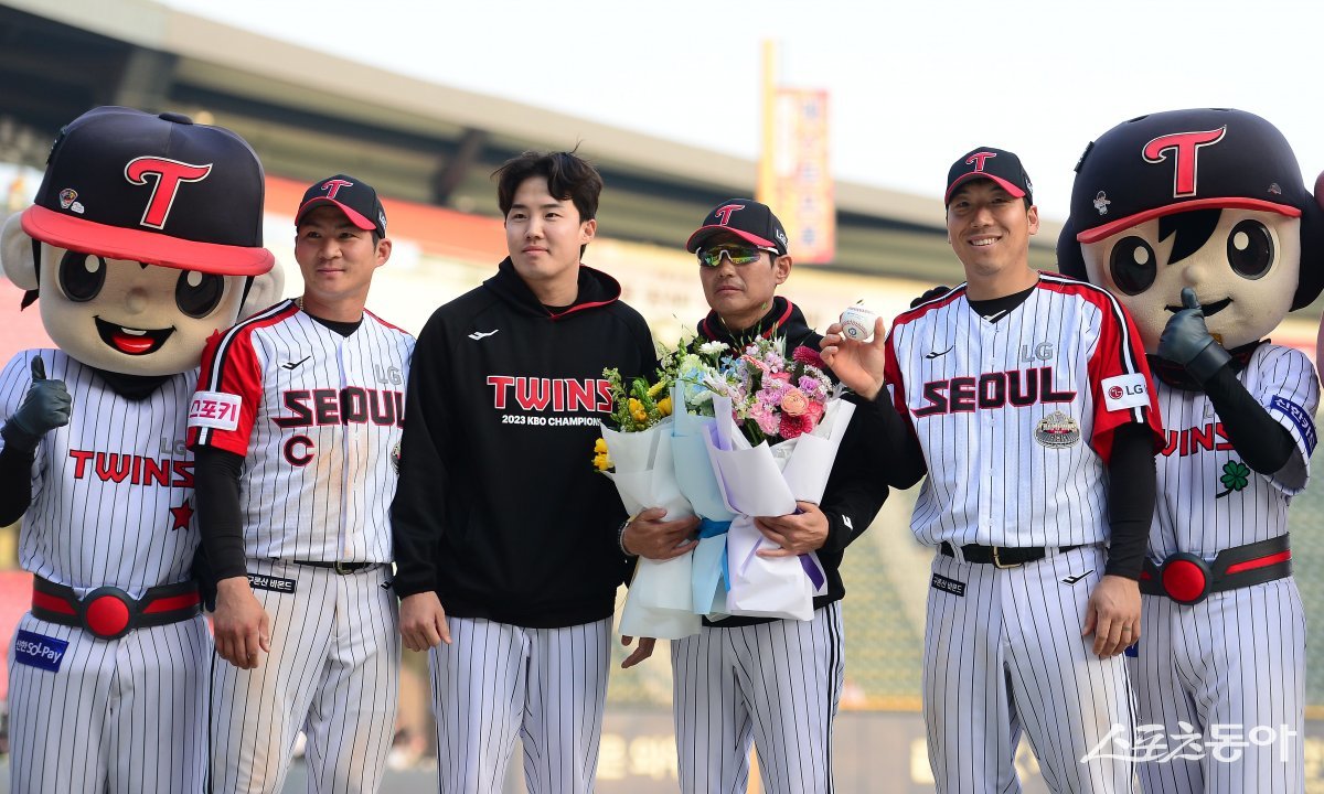 7일 서울 잠실야구장에서 ‘2024 신한은행 SOL뱅크 KBO리그’ KT 위즈와 LG 트윈스 경기가 열렸다. 역대 13번째 500승을 달성한 LG 염경엽 감독이 오지환, 임찬규, 김현수와 기념촬영을 하고 있다.