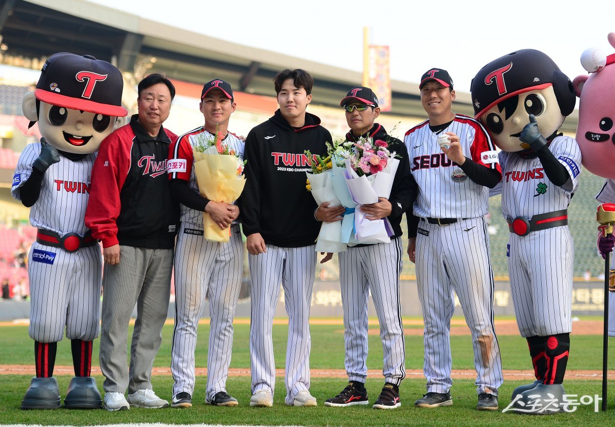 7일 서울 잠실야구장에서 ‘2024 신한은행 SOL뱅크 KBO리그’ KT 위즈와 LG 트윈스 경기가 열렸다. 역대 13번째 500승을 달성한 LG 염경엽 감독이 차명석 단장, 오지환, 임찬규, 김현수와 기념촬영을 하고 있다.